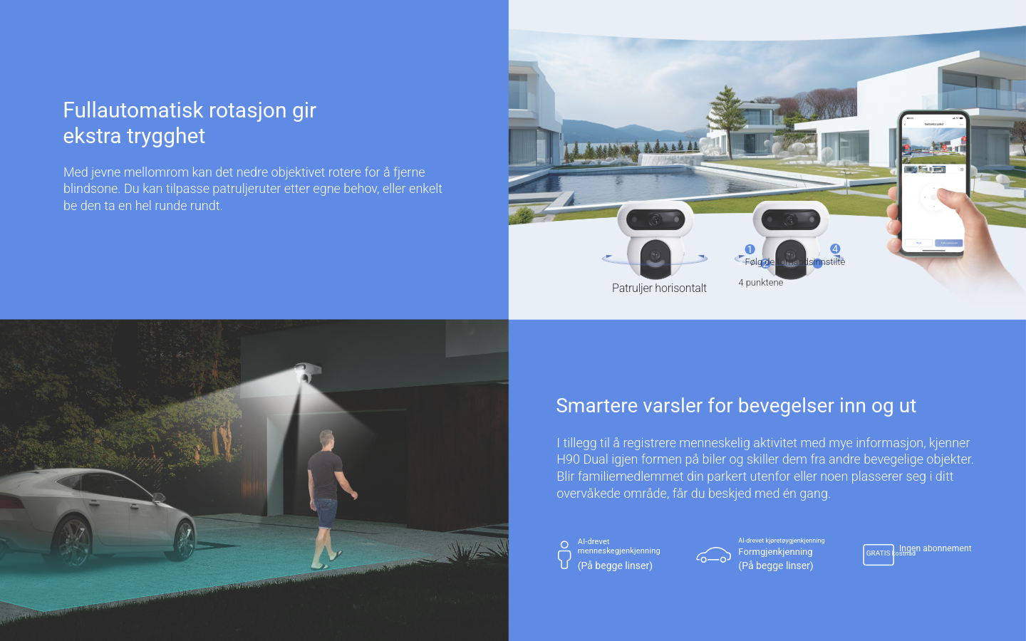 Full kontroll 24/7 med 2K+ dobbel linse! Smart sporing, lyd- og lysvarsler, 360° panoramadekning og farge-nattesyn.