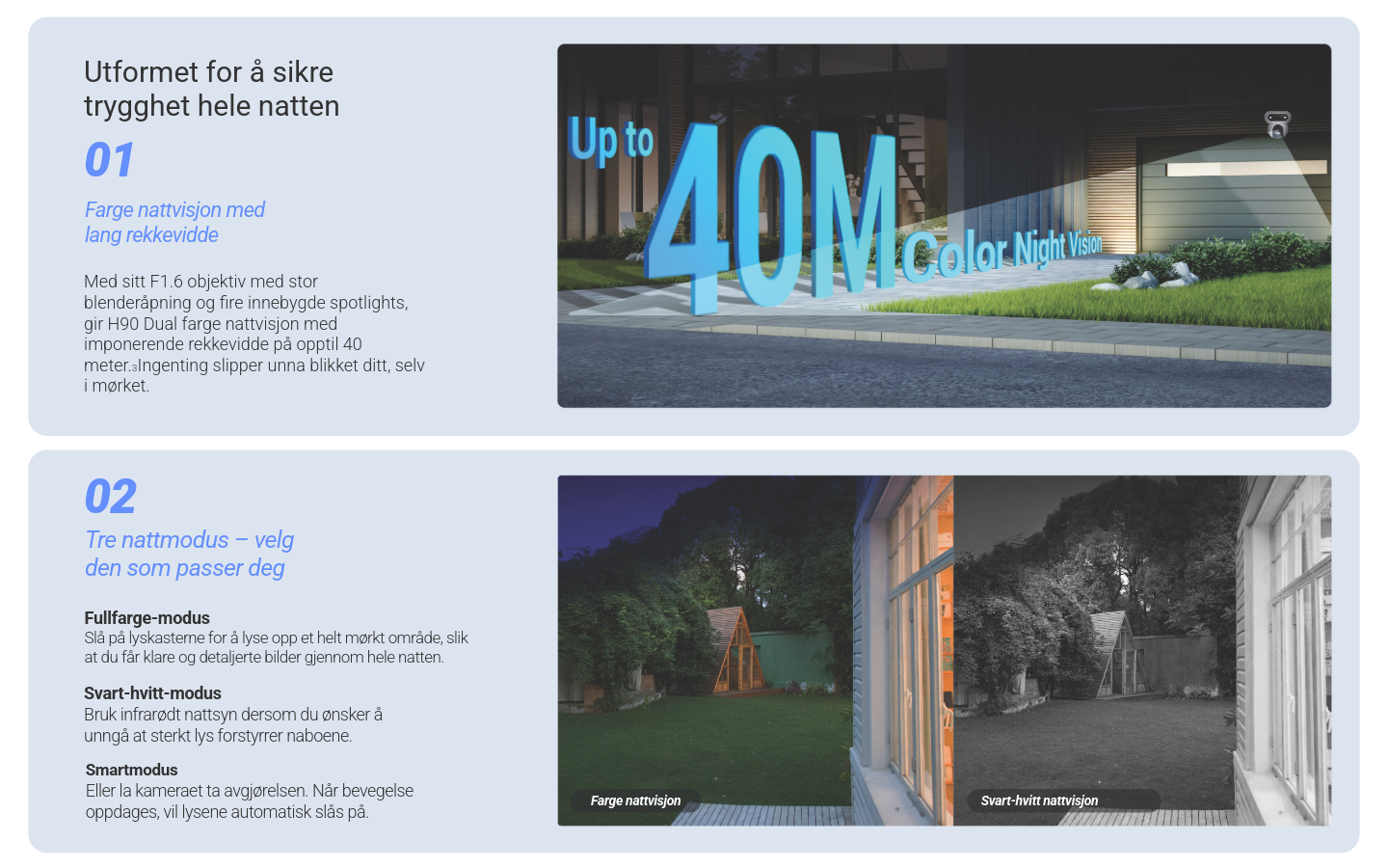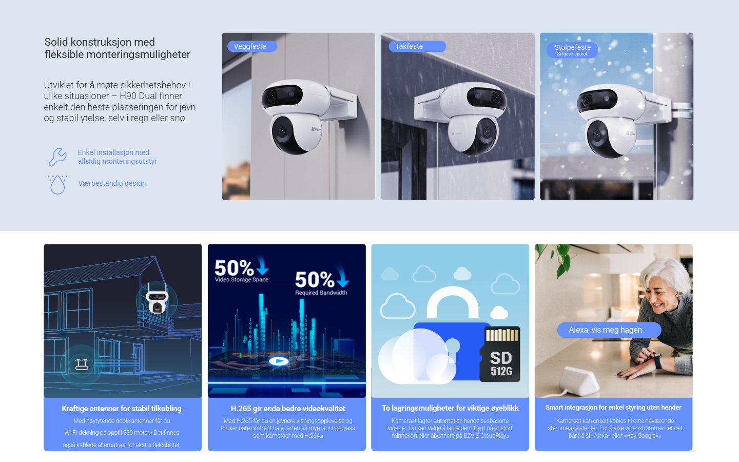 Med én-trykks visningsbytte, balanserte lysforhold og farge-nattesyn ser du tydelig både dag og natt. To-veis tale lar deg kommunisere direkte, mens 360° panoramadekning sikrer full oversikt. Kameraet har værbestandig design, H.265 videokomprimering, forbedrede dobbel Wi-Fi-antenner og integrasjon med både Google og Alexa.