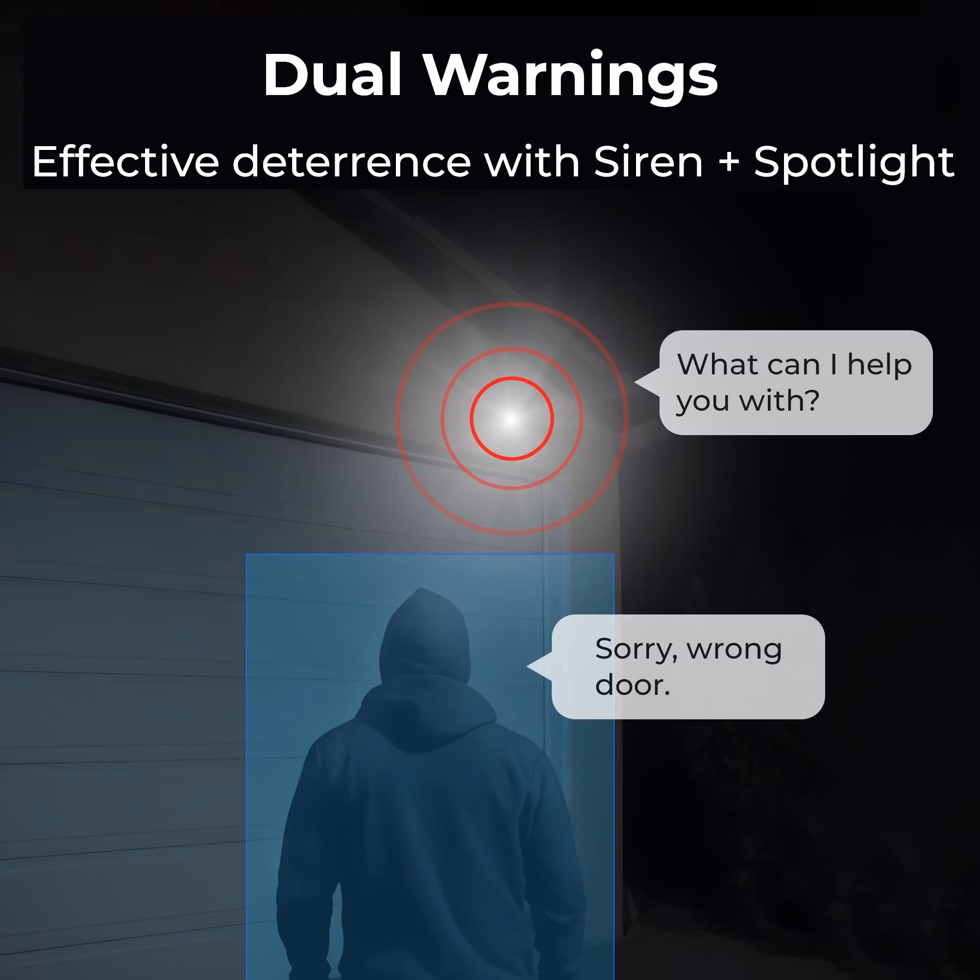 Når kameraet oppdager noe mistenkelig, utløses spotlysene og den innebygde sirenen automatisk for å advare inntrengere. Du kan også slå dem av og på manuelt etter behov.