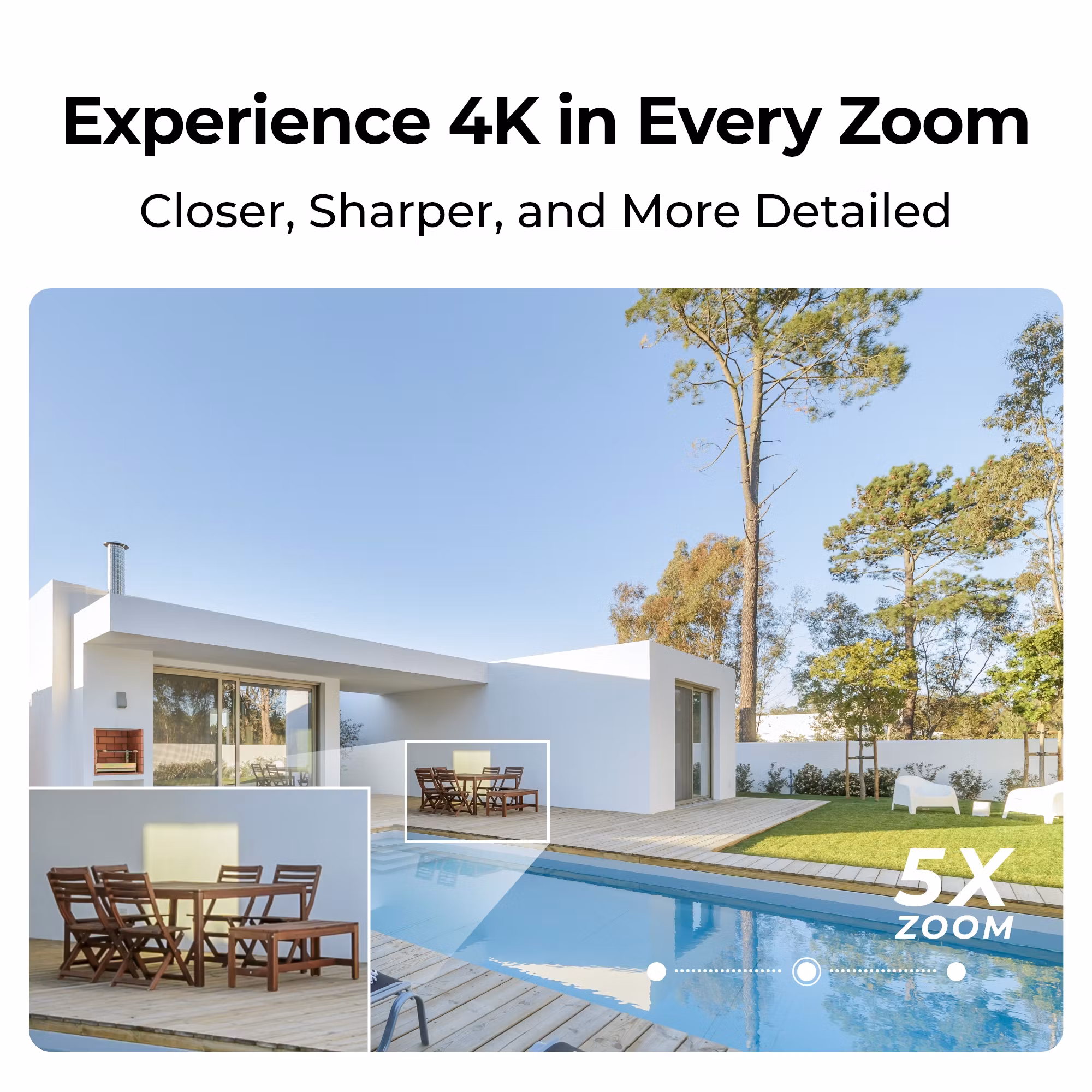 forbedret synlighet med 4K og 5X optisk zoomMed 4K-oppløsning tar kameraet knivskarpe bilder med de fineste detaljer. Det kan til og med zoome inn 5X optisk på objekter langt unna uten at det går ut over bildekvaliteten. Uansett om det er på avstand eller på nært hold, vil ikke en eneste detalj unnslippe kameraets årvåkne øye.