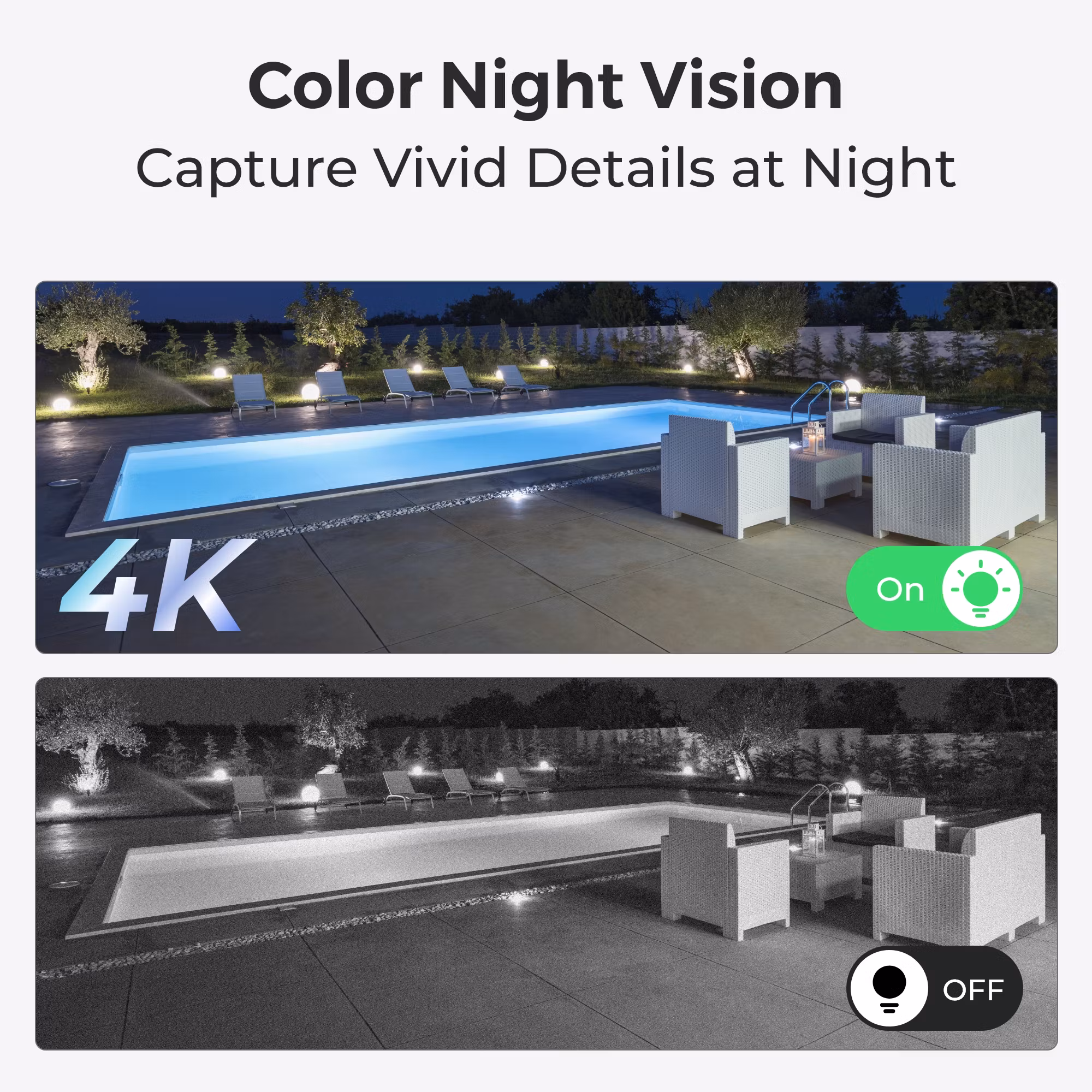 Fra dag til natt leverer kameraet et skarpere og mer naturtro bilde som er fire ganger skarpere enn HD. Når mørket faller på, kan du nyte levende farger med spotlysene på, eller du kan velge det infrarøde svart-hvitt-synet for klarhet på opptil 60 meters avstand.