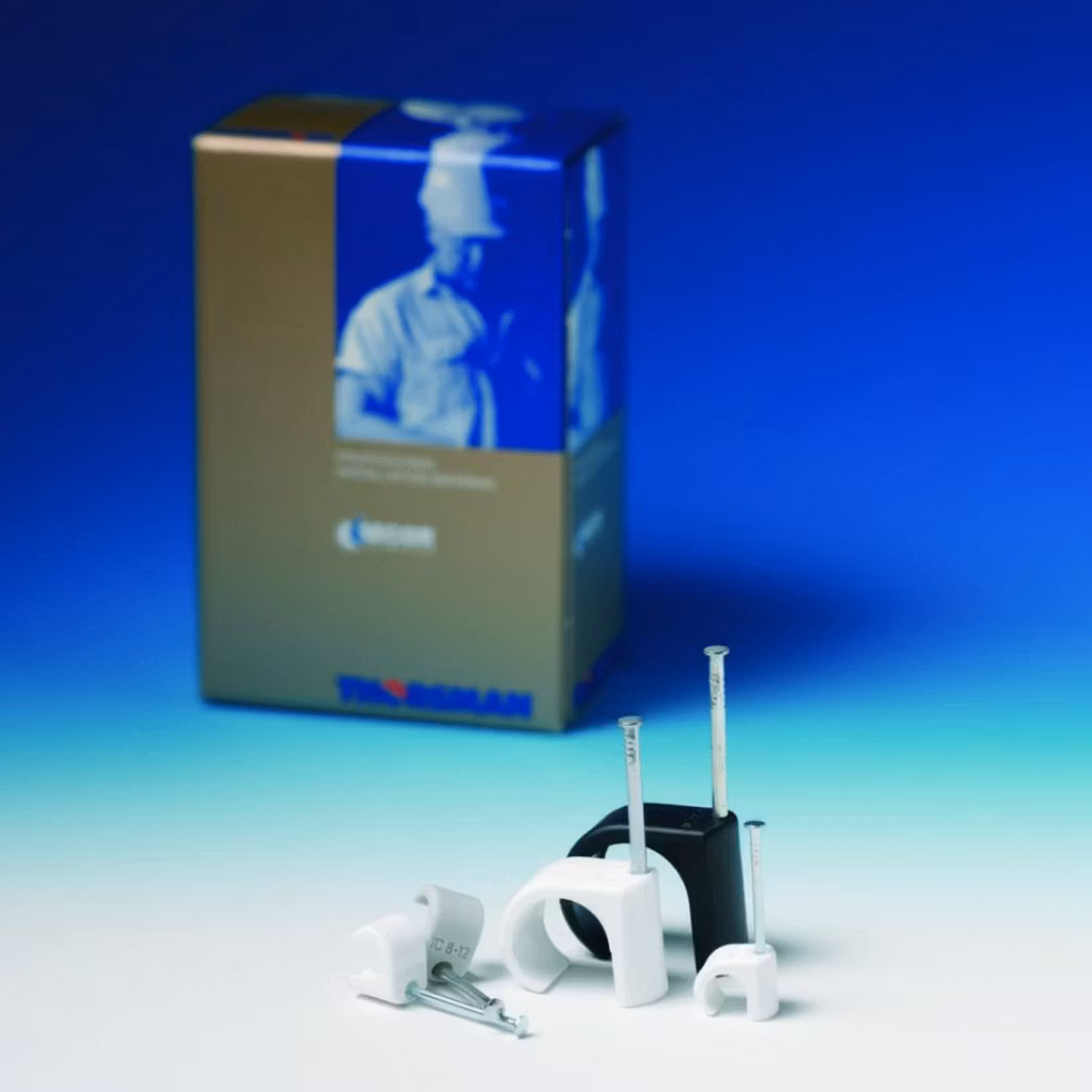 Clips type TC for montering av runde og ovale kabler. Brukes i tre- og sponplater. Skal den brukes i andre materialer: f.eks gips, betong, lettbetong og tegl brukes TC + clipsplugg TCP