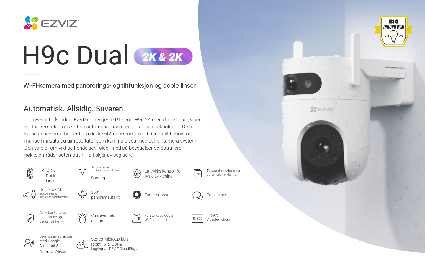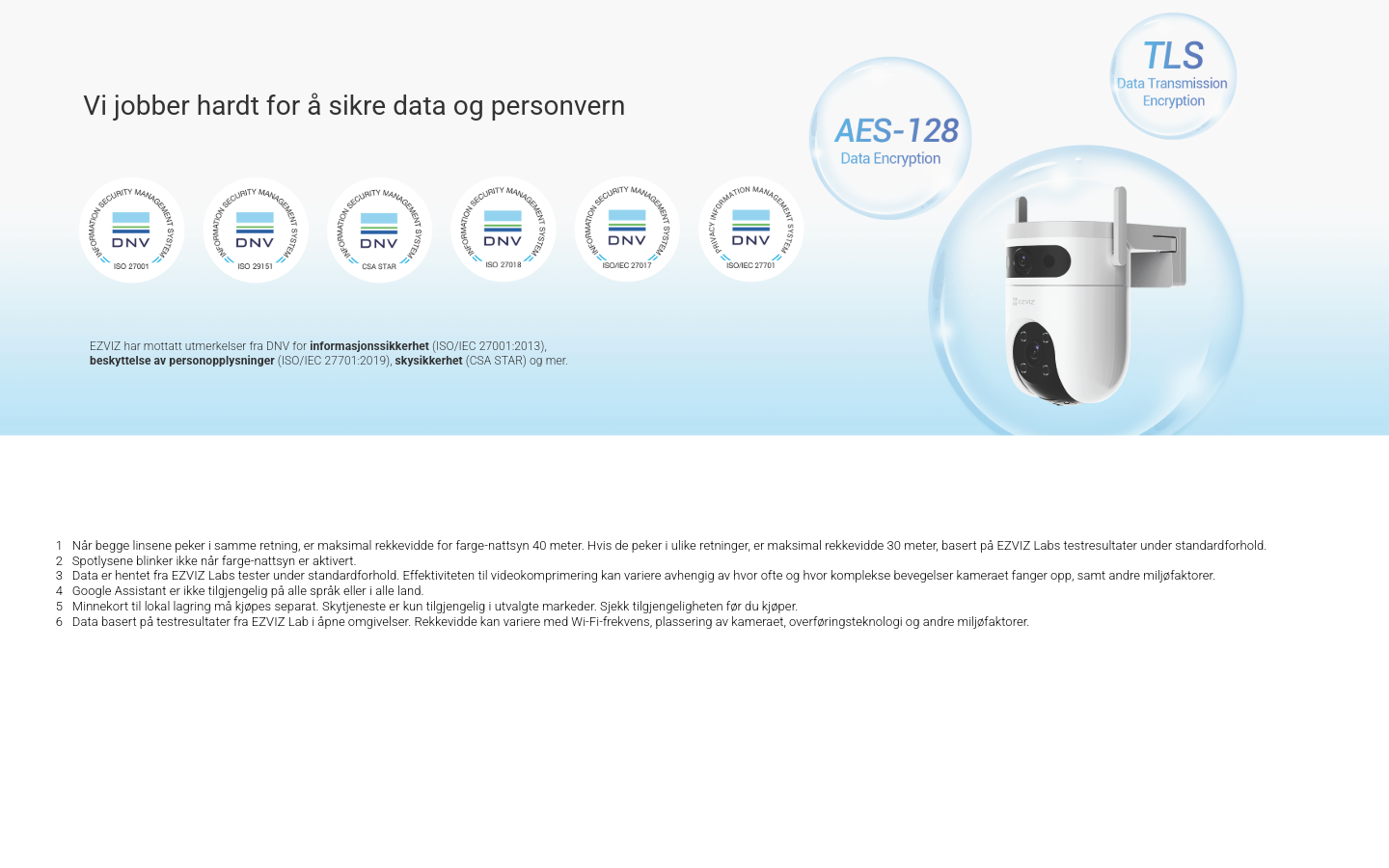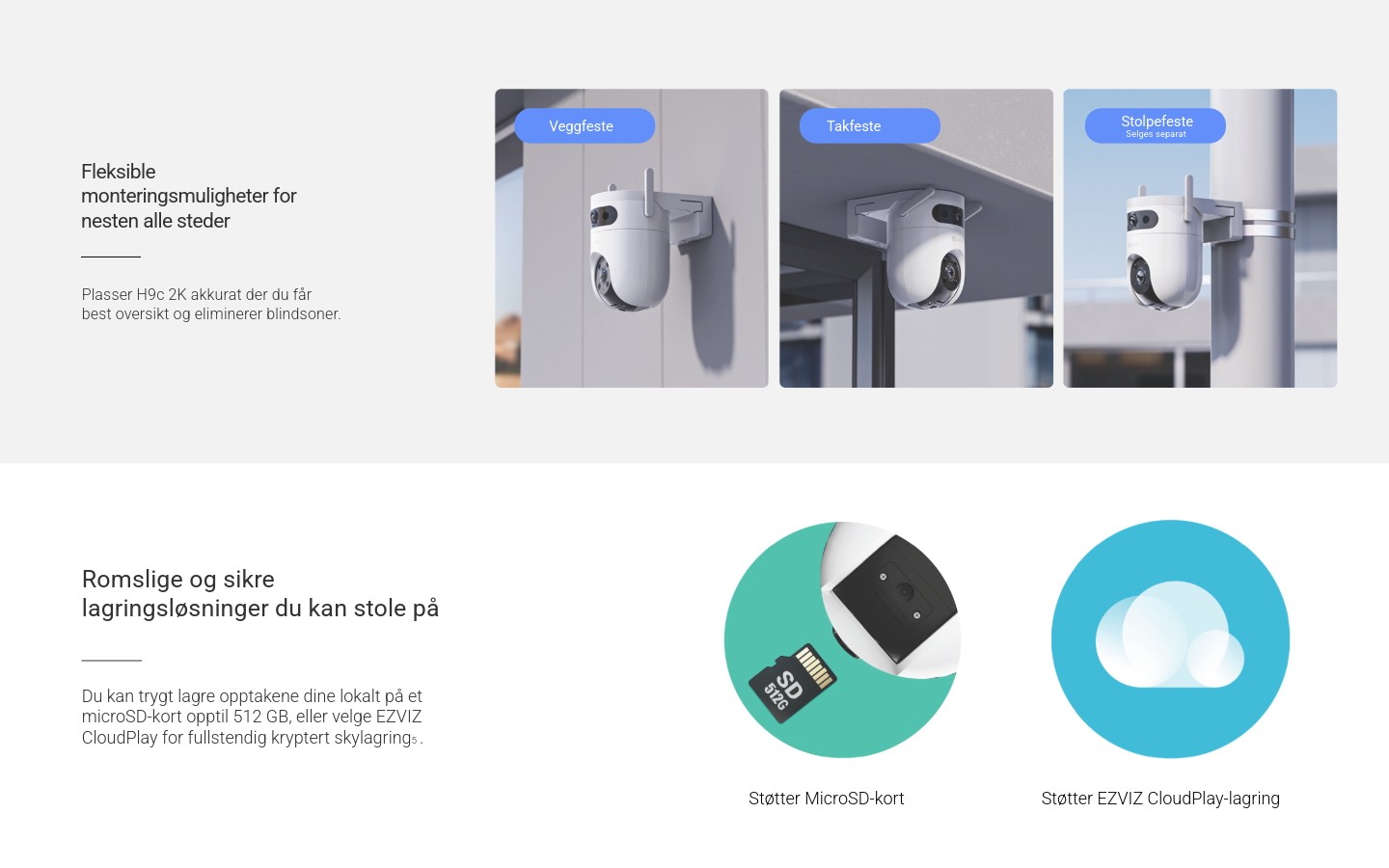 Lagring og sky: MicroSD-kort opptil 512 GB og EZVIZ Cloud-støtte for trygg lagring.