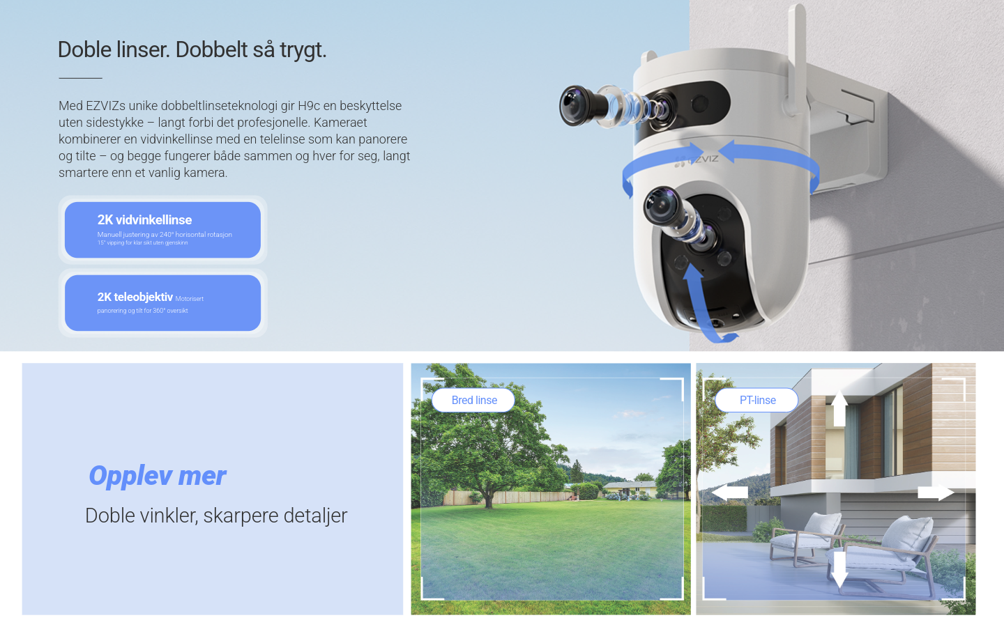 Krystallklar 2K-visning: Panoramisk hovedkamera og fullbilde toppvisning for maksimal oversikt.