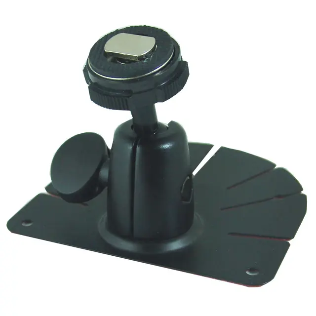 Kraftig festebrakett i metall. Kuleledd gjør at den kan stilles inn i alle vinkler. Dobbelsider tape på baksiden, kan også skrues fast.